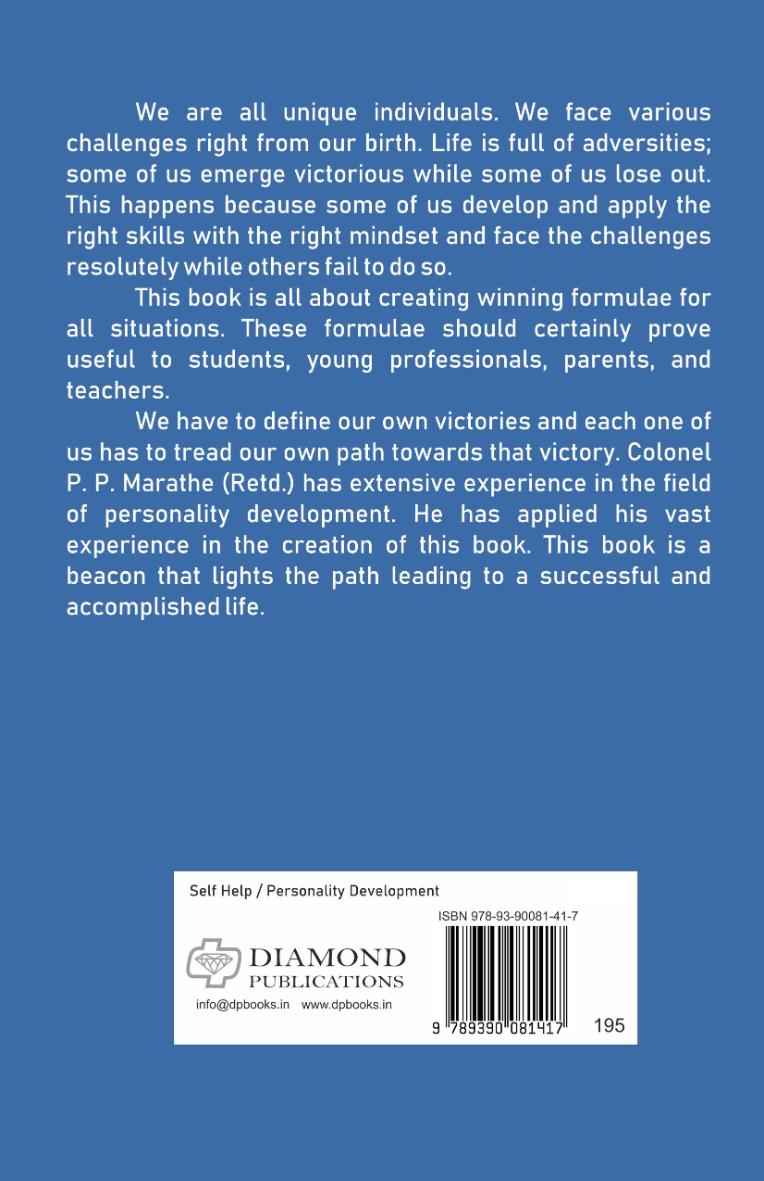 We have to define our own victories and each one of us has to tread our own path towards that victory. Colonel P. P. Marathe (Retd.) has extensive experience in the field of personality development. He has applied his vast experience in the creation of this book. This book is a beacon that lights the path leading to a successful and accomplished life.